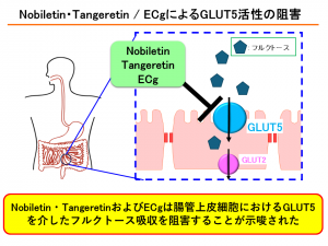 代表的な研究が、肥満と強い相関関係があるとされるフルクトースの腸管吸収阻害効果を有する食品成分を探索する研究だ。前述したようにフルクトースはGLUT5から吸収されることが分かっている。薩氏は腸管上皮モデルCaco-2細胞を用いて、数十種類の食品成分をスクリーニングした結果、「強い吸収阻害効果を示したのは、柑橘類に含まれるフラボノイドであるNobiletinとTangeretin、緑茶カテキンのECg(エピカテキンガレート)だった」という(図1)。