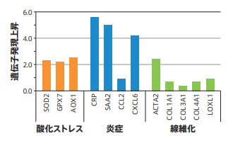 酸化ストレス・炎症・線維化に関わる遺伝子発現の上昇が確認され、MASHの発症機序とされる「2ヒット理論」に沿ったモデルです。